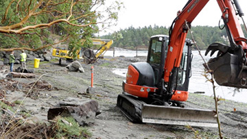 On tiny Brown Island, just off San Juan Island in well-protected Friday Harbor, the owners of three adjacent properties decided to take on a bulkhead removal and beach restoration project together. Drag the slider to see the Brown Island site before and after the removal of large rocks piled along the shore.